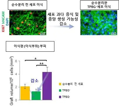 더불어, 기존에 부작용이었던 세포 과다 증식 등의 문제도 감소한 것을 확인했다. TPBG를 이용해 순수분리한 세포(TPBG+ 세포)를 이식한 이식편(이식부위)에서는 분리 전의 세포 이식과 비교해 과다 세포 증식이나 종양의 원인이 되는 세포(Ki67+ 세포)가 현저히 줄어들고(약 31.9% 감소), 증식 세포의 감소로 이식편(이식부위)의 부피도 감소 (약 35% 감소)한 것이 확인됐다 [그림 2].