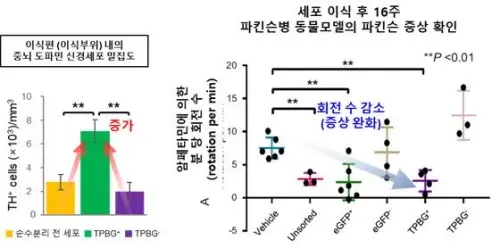 도파민 신경세포 수가 TPBG를 이용해 순수분리해 이식할 경우 순수분리 전 세포 이식보다 약 2.5배 증가하는 것을 확인했다.