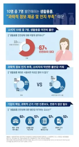 소비자 10명 중 6.7명은 생활용품이 안전하지 않다고 생각하고 76%가 화학물질을 합성해 만든 제품은 위험할 수 있다고 답한 것으로 나타났다. 또한 화학성분이 든 생활용품은 제대로 사용하면 이로운 점이 더 많다.’에 대해 10명 중 4명이 동의한 반면, 생활용품에 대해 과학적인 정보를 인지하고 있는 소비자의 경우 6.7명이 동의한 것으로 나타나, 소비자들의 생활용품 안전성에 대한 과학적 정보 부족이 막연한 불안감을 키우고 있는 것으로 나타났다.