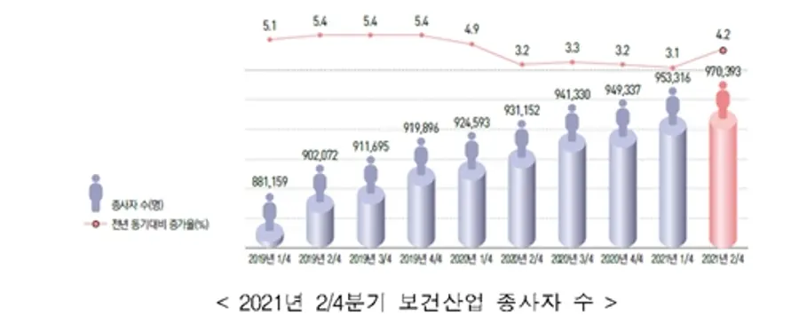 (총괄) 2021년 2/4분기 보건산업 종사자 수는 97만 명으로 전년 동기대비 4.2%(+3만9천 명) 증가했다.
