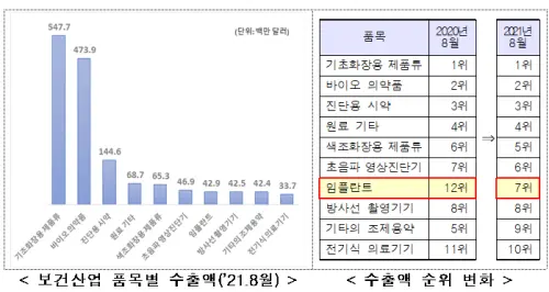 한국보건산업진흥원(원장 권순만, 이하 진흥원)은 2021년 8월 월간 보건산업 수출 실적을 발표하였다.
