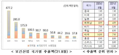 국가별 보건산업(의약품+의료기기+화장품) 수출 순위는 중국(4.8억 달러, +24.4%), 미국(2.8억 달러, +82.7%), 일본(1.8억 달러, +48.4%), 베트남(1.0억 달러, +155.7%) 등 순으로 나타났다.