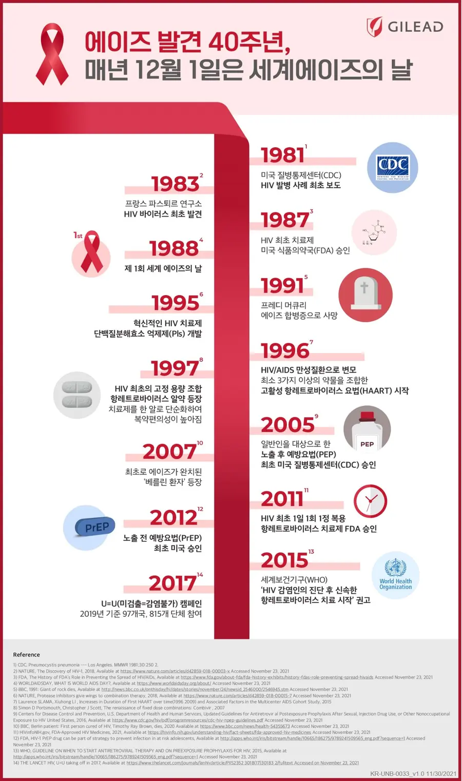 길리어드 사이언스 코리아(대표이사 이승우)는 12월 1일 세계 에이즈의 날을 맞아 에이즈 발견 40주년을 기념하고 HIV/AIDS에 대한 질환 인식을 높이기 위해 인포그래픽을 제작했다고 1일 밝혔다.