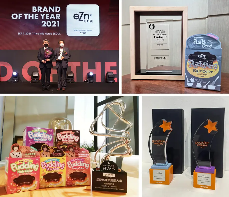 ▲ 위쪽 왼쪽부터 ‘2021 올해의 브랜드 대상’ 수상, ‘2021 올리브영 어워즈’ 헤어컬러링 부문 수상, ‘HWB(헬스웰니스뷰티) 어워드’ 신인제품상 수상, ‘Guardian Health Beauty Award 2021’ ‘Influencers' Choice’, ‘Best Newcomer’ 수상