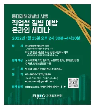 이대목동병원 이화건강검진센터(센터장 김현주 이대목동병원 직업환경의학과 교수)가 25일 오후 2시 30분부터 두 시간 동안 ‘중대재해처벌법 시행에 앞서 직업성 질병 예방’을 주제로 온라인 세미나를 개최한다.